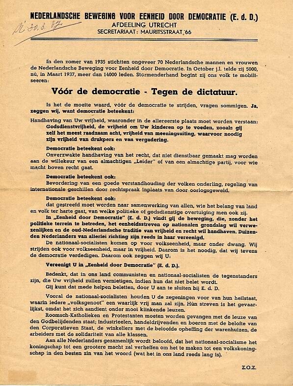 Pamflet met een oproep tot aanmelding bij de Nederlandsche Beweging voor Eenheid door Democratie.