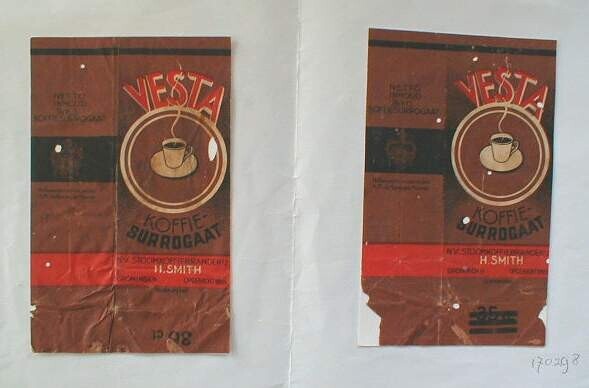 Twee exemplaren van deel van een verpakking van een half pond Vesta koffiesurrogaat. De verpakkingen zijn geplakt op een vel wit papier.