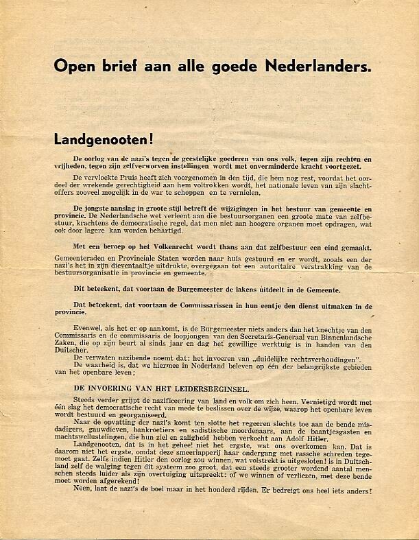 Open brief met een oproep tot verzet tegen de Duitse overheersing.
