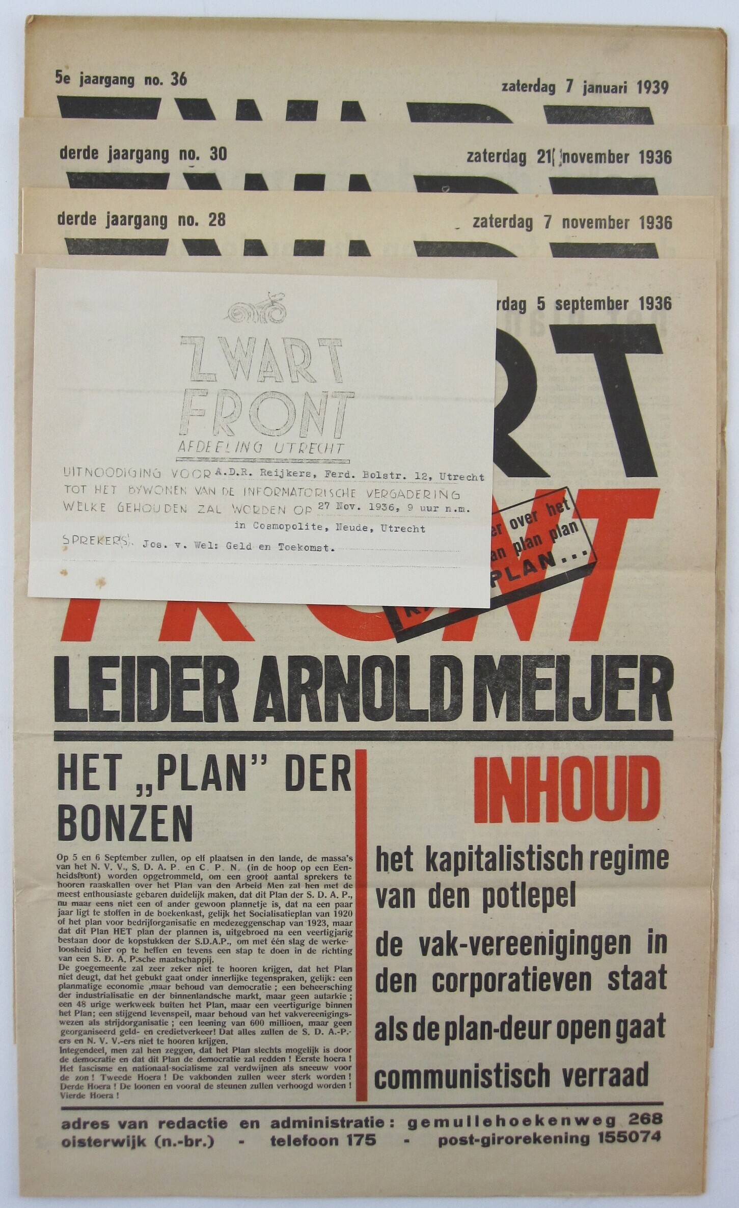 Vier exemplaren van "Zwart Front", orgaan van de gelijknamige Nederlandse fascistische organisatie die actief was van 1934 tot 1941. Het Zwart Front werd opgericht door Arnold Meijer, wiens naam op de voorpagina is gedrukt. Er zijn drie exemplaren van de derde jaargang (5 september, 7 en 21 november 1936) en een exemplaar van de vijfde jaargang (7 januari 1939). Op een van de exemplaren is een persoonlijke uitnodiging gelijmd voor het bijwonen van een "informatorische vergadering".