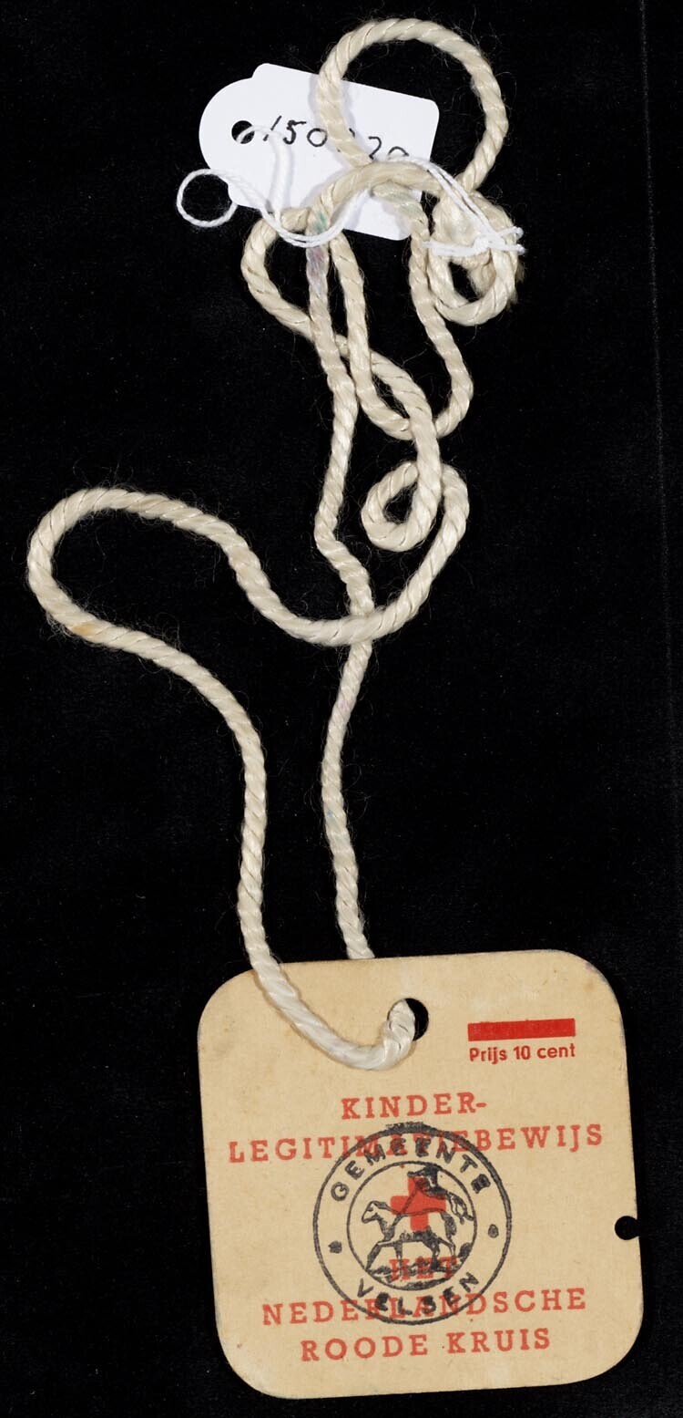 Een vierkant kartonnen kaartje met afgeronde hoeken en een ponsgaatje aan de zijkant. Het kaartje is bevestigd aan een wit katoenen koordje. Op één kant van het kaartje staat met rood gedrukt: "Kinder Legitimatiebewijs, Het Nederlandsche Roode Kruis, 10 cent" met hierover een stempel van de gemeente Velsen. Op de andere kant staan de personalia van de houder: "Gesl. naam: Zuidervaart; Voornamen: Hendrik; Geb. Dat.: 3 december 1939; Woonpl. Str. en No.: Velsen, Gr. Hout of Koningsweg 30".