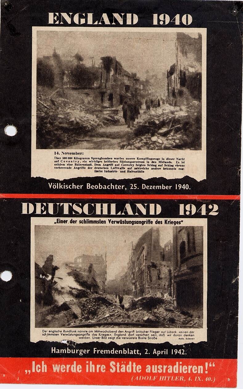 Geallieerd (Duitstalig) pamflet waarin het Duitse bombardement van Coventry in 1940 wordt vergeleken met het Britse bombardement van Lübeck in 1942.
