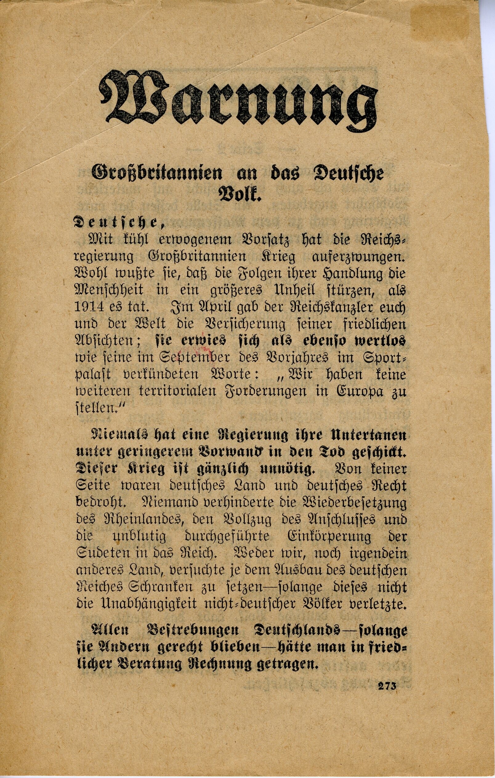 Vijf exemplaren van een door Engeland verspreid (Duitstalig) pamflet, gericht aan het Duitse volk.