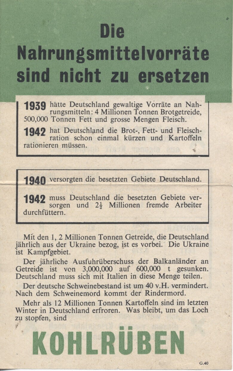 Twee exemplaren van een geallieerd (Duitstalig) pamflet waarin de verslechterde situatie van de Duitse levensmiddelenvoorraad wordt besproken.