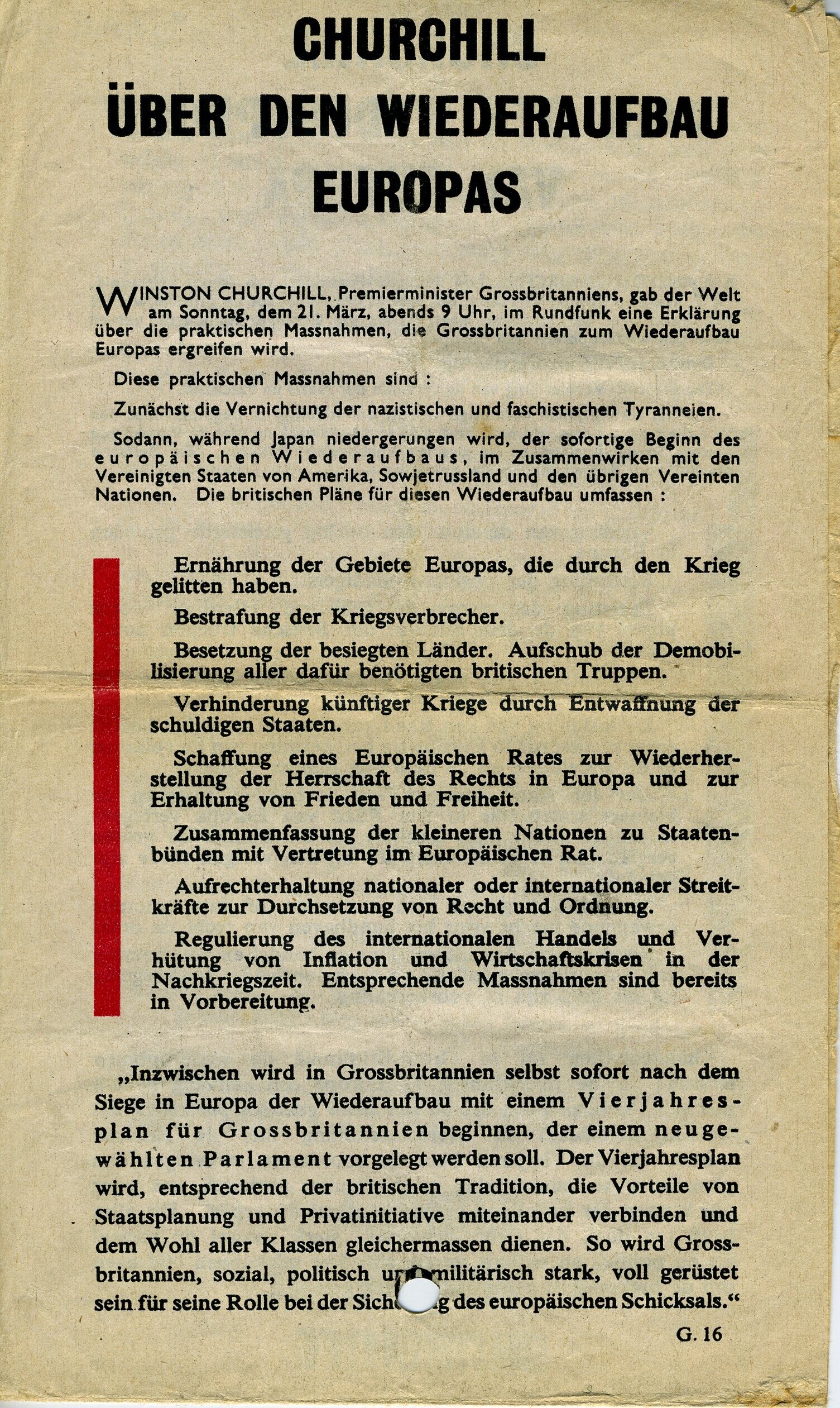 Geallieerd pamflet in vier talen (Duits, Frans, Nederlands en Pools) waarin geschreven wordt over een toespraak van Churchill met betrekking tot de geallieerde plannen voor na de oorlog.