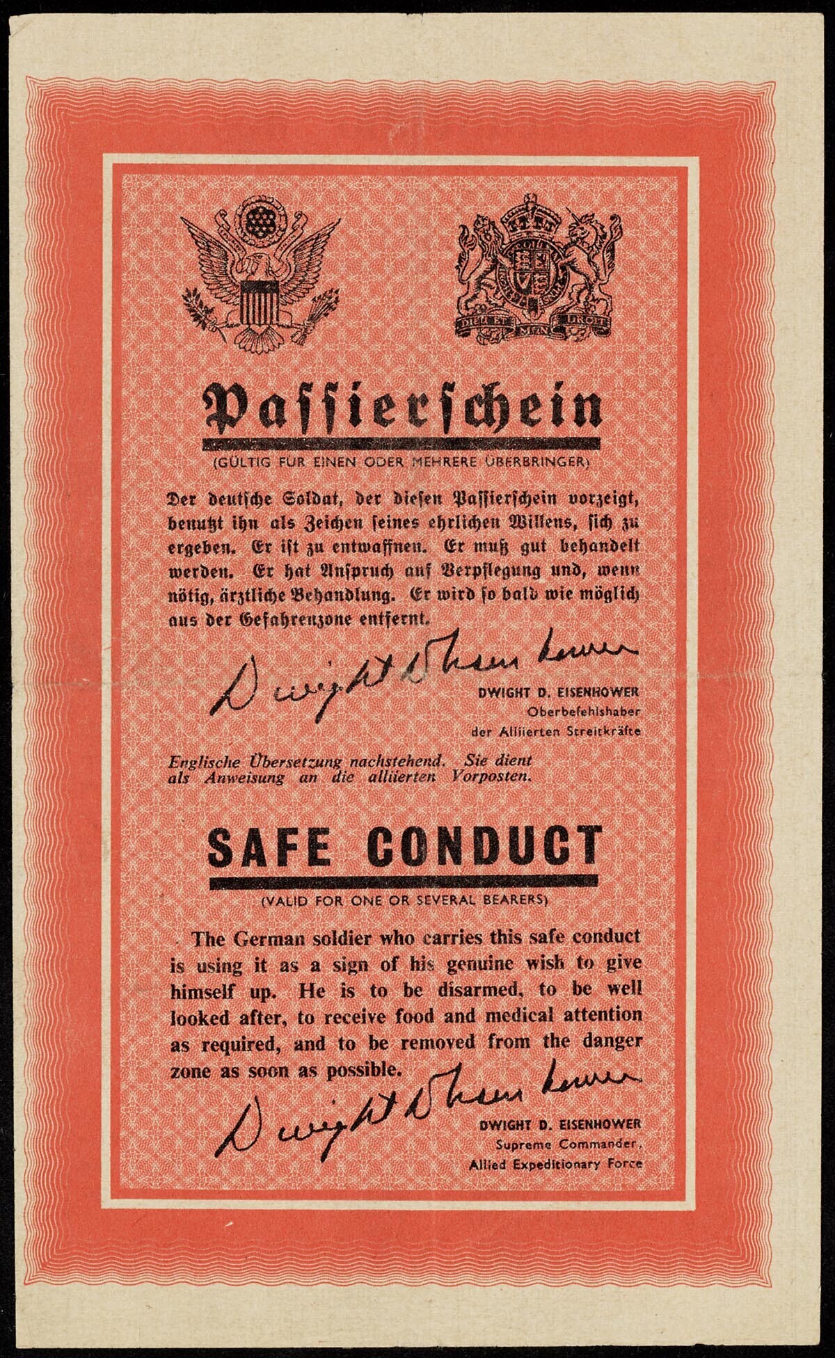 Geallieerd pamflet in twee talen: Duits en Engels. Dit pamflet werd door de geallieerden verspreid met de bedoeling dat Duitse soldaten het konden gebruiken als bewijs van overgave. Op de achterzijde staat een uittreksel van de Haagse Conventie (1907) en de Conventie van Geneve (1929).