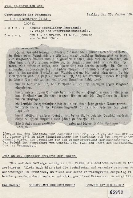 Geallieerd (Duitstalig) pamflet waarin tegenstrijdigheden worden geconstateerd tussen prognoses van de Duitse legerleiding in 1941 met betrekking tot het oorlogsverloop en latere uitspraken van Hitler.