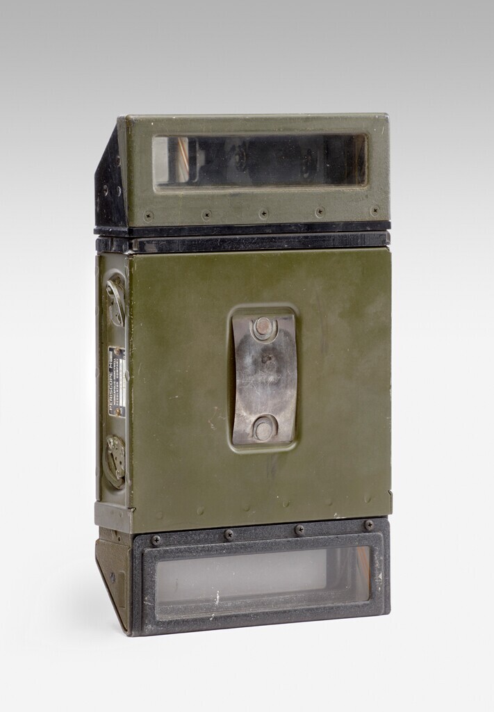 Een plat uitgevoerde M6 tankperiscoop voor een Sherman Chaffee Grant Lee Stuart met instelknop. Op de zijkant een aluminium plaatje met: "Periscope M6. Minneapolis-Honeywell Regulator Company" en serienummer en 1942. Deze periscope werd gebruikt door Amerikaanse, Britse, Canadese en andere geallieerde troepen.