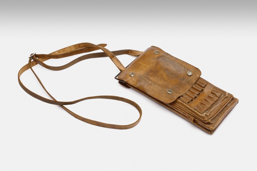 Een rechthoekige lichtbruine leren tas met verschillende vakken met klepsluitingen vast te zetten door drukknopen. De tas heeft een draagriem bevestigd aan een koperen beugel aan de bovenkant. Op de voorkant kleine halfronde houders voor het opbergen van potloden en pennen. het gaat om een 'Meldekartentasche M35' van de Duitse Wehrmacht.