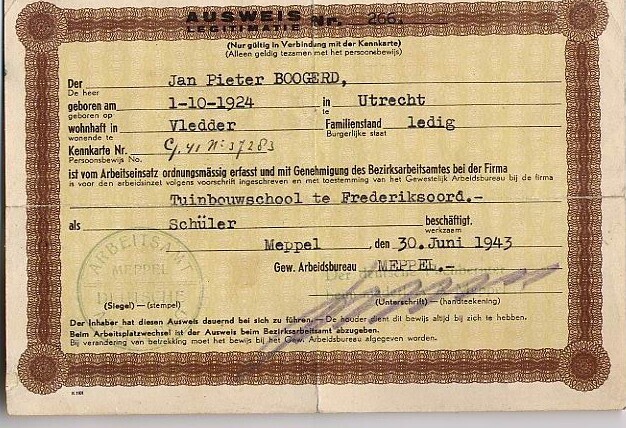 Identiteitsbewijs van J.P. Boogerd waarin is aangegeven dat hij voor de arbeidsinzet is ingeschreven als leerling van de tuinbouwschool te Frederiksoord.
