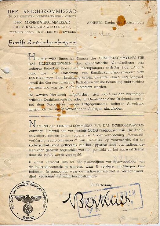Verklaring gericht aan de bezitter van een radio-ontvanger de heer Wall, dat deze onder voorwaarden zijn toestel mag behouden. De verklaring is in het Duits en het Nederlands opgesteld.