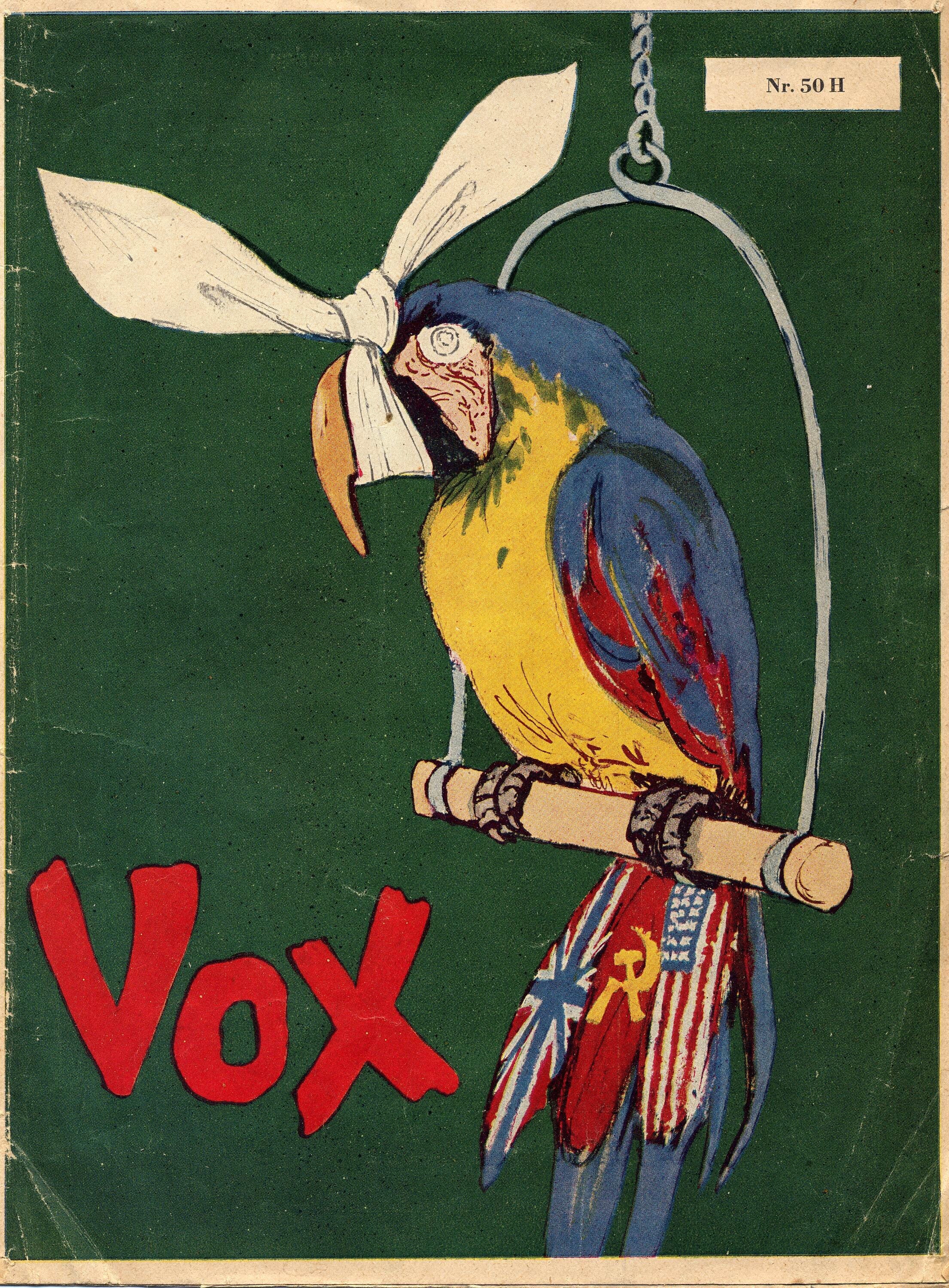 Geallieerd satirisch tijdschrift Vox no. 50H. Op de frontpagina een papegaai op stok waarvan de bek is gesnoerd met een lap. In de staart de vlaggen van Engeland, Rusland en Amerika. Het tijdschrift is drietalig: Nederlands, Frans en Engels.