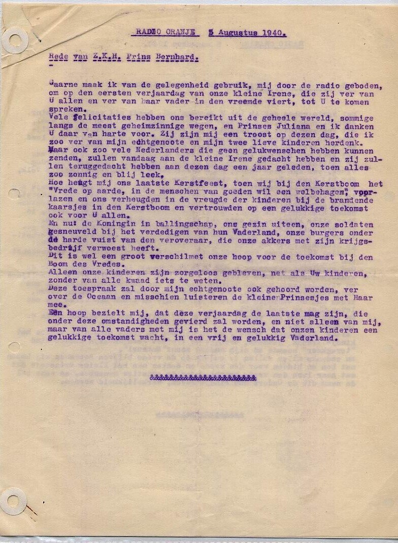 Twee doorslagen met in paarse inkt de tekst van twee redes gehouden voor Radio Oranje. Eén van prins Bernhard en een van Ds. van Dorp.