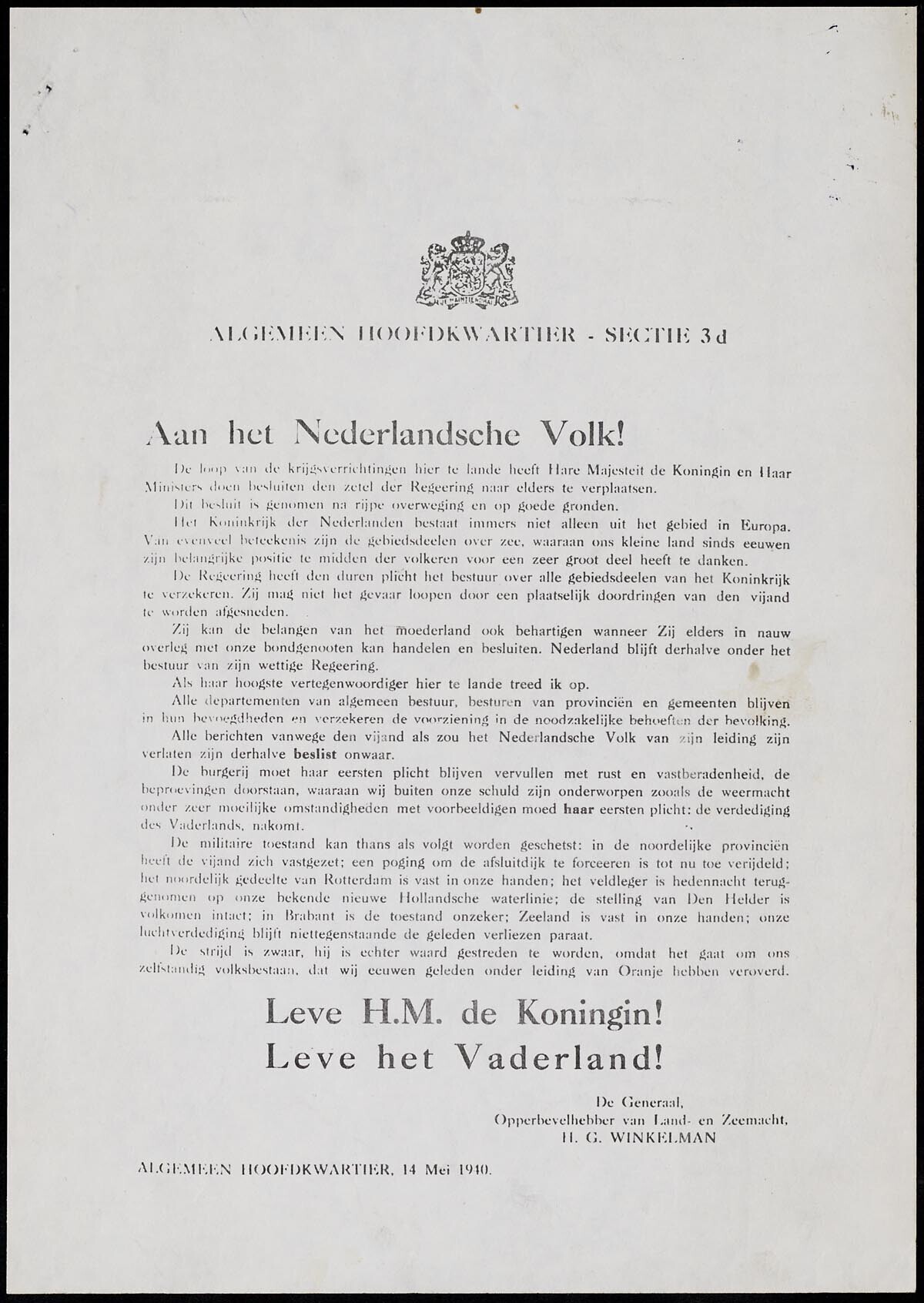 Bericht vanuit het Algemeen Hoofdkwartier van generaal H.G. Winkelman over de verplaatsing van de Nederlandse regering.