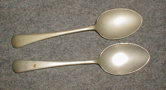 Twee vrijwel identieke lepels. Op de achterkant het productiejaar 1944 met een kleine pijl. Engels fabricaat.
