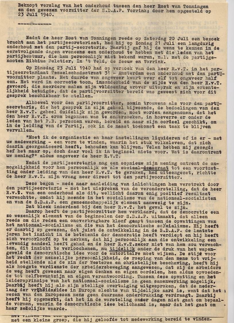 Een getypt "Beknopt verslag van het onderhoud tussen den heer Rost van Tonningen en den gewezen voorzitter der S.D.A.P. Vorrink"; door hem opgesteld op 23 juli 1940". Het verslag telt drie losse stencilvellen.