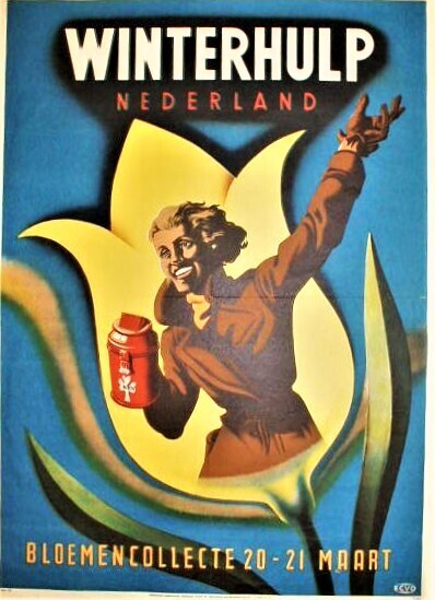 Een affiche van de Winterhulp Nederland in rode, gele, zwarte, blauwe en witte opdruk voor de "Bloemencollecte 20 - 21 maart". Afgebeeld is een collectante in het hart van een gele tulp op een blauwe achtergrond.