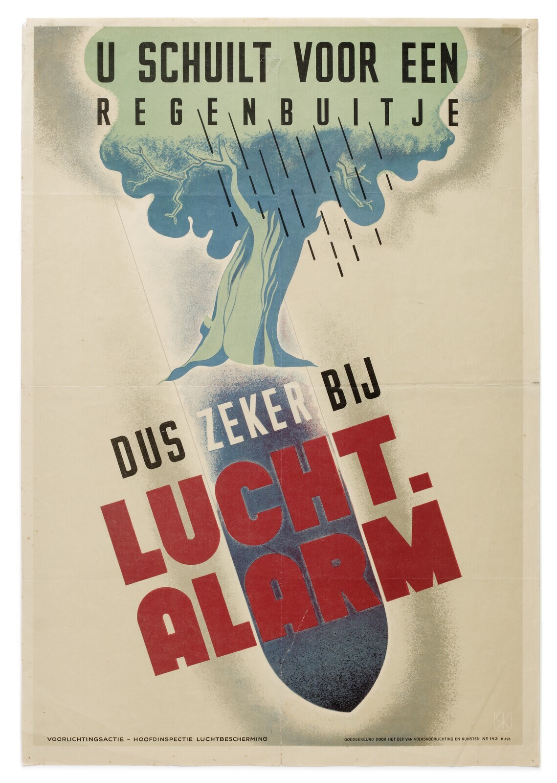 Affiche waarop mensen verzocht worden om dekking te zoeken in een schuilkelder bij luchtalarm. Afgebeeld is een boom in de regen en een bom met de tekst: "U schuilt voor een regenbuitje dus zeker bij lucht-alarm".