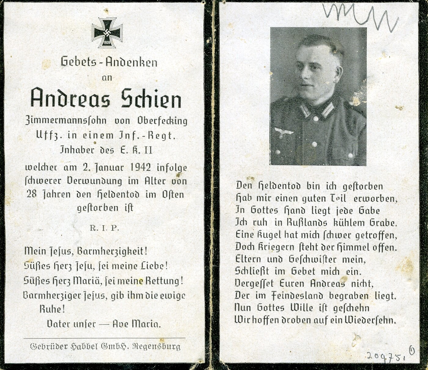 Een serie van zes bidprentjes van gesneuvelde Duitse soldaten. Op een kant is het doodsbericht met portret van de gesneuvelde afgedrukt. Op de andere kant een religieuse afbeelding met bijbelspreuk. Het gaat om: Andreas Schien, Josef Kipfelsperger, Marc Buchner, Georg Kurz, Johann Wittmann en Alfons Metzger.