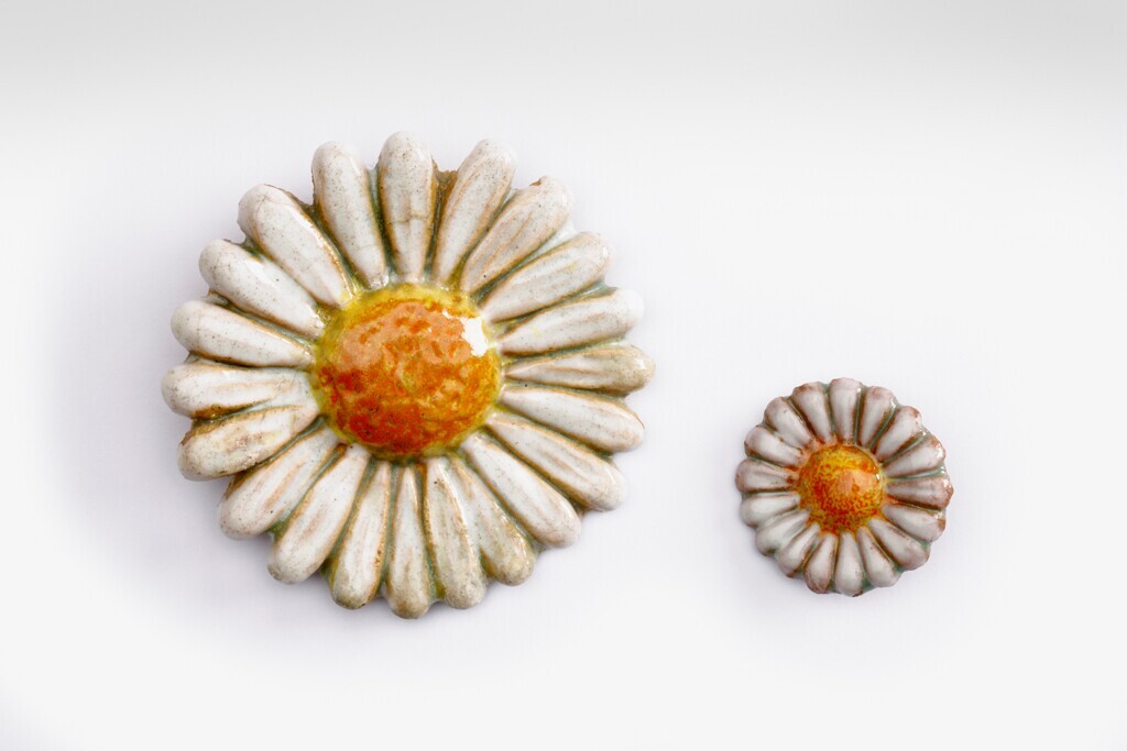 Een grote en een kleine broche van aardewerk in de vorm van de bloem van een margriet. De grote is voorzien van een speld, de kleine kan als knoop opgenaaid worden. De voorstelling van de broches verwijzen naar de geboorte van prinses Margriet en werden gedragen als stil verzet tegen de Duitse bezetting.