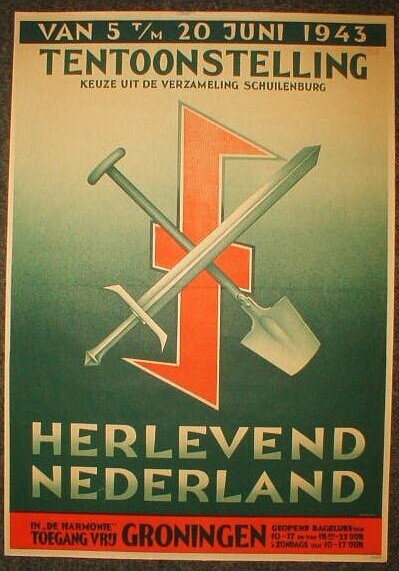 Affiche voor de "Tentoonstelling Herlevend Nederland" te Groningen van 5 t/m 20 juni 1943 samengesteld uit de verzameling van H.L. Schuilenburg. Als beeldmerk een rode 'Wolfsangel' met daarop een gekruiste spade met een zwaard.