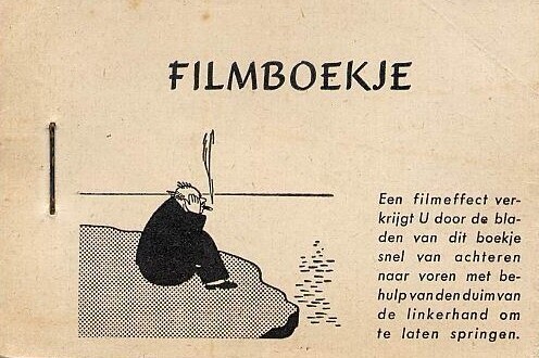 Twee klein formaat animatieboeken met tekeningen waarop Churchill, zittend op een eiland, aangevallen wordt door een 'V'.