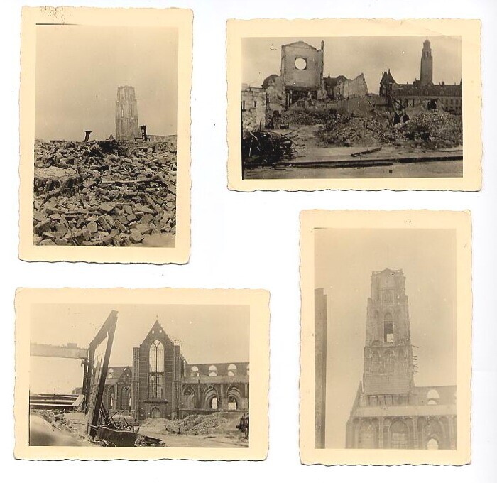 Vier zwart-witfoto’s van de schade van de grote kerk te Rotterdam na het bombardement.