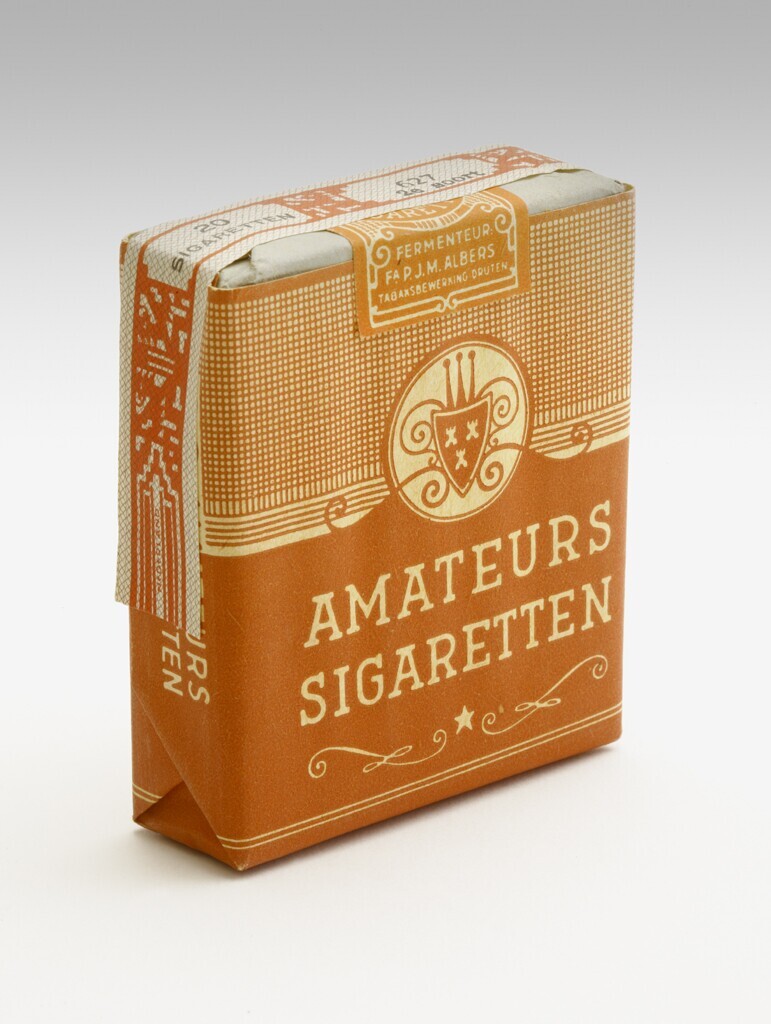 Een bruinrood ongeopende pakje Amateurs sigaretten met de banderol intact. Op de sluitzegel onder de banderol staat: "Fermenteur Fa. P.J.M. Albers".