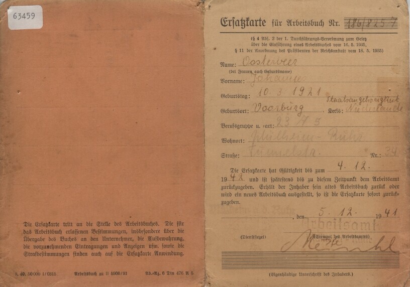 Een gedrukte identiteitskaart uitgegeven op 5 december 1941 op naam van Johannes Oosterveer, geboren op 10 maart 1921 en woonachtig te Voorburg. Bovenaan staat: "Ersatzkarte für Arbeitsbuch Nr. 186/8257". De kaart is geldig tot 4 december 1942. Tevens een stempel van het Arbeitsambt en een adres in Duitsland: Mühlheim - Ruhr, Tunnelstr. 34.