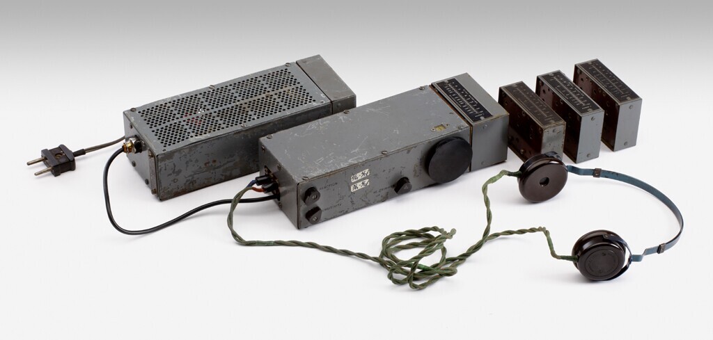 Een grijs metalen radio-ontvanger bestaande uit twee delen, met drie afzonderlijke spoelen voor verschillende golflengten; compleet met koptelefoon. Tijdens de bezetting vanuit Engeland gedropt, ten behoeve van de illegaliteit.