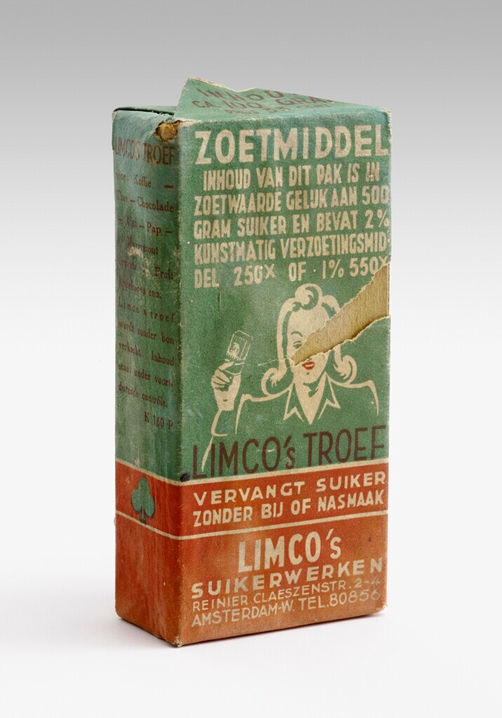 Een zoetmiddel ter vervanging van suiker "zonder bij of nasmaak". Op de verpakking de merknaam: "Limco's Troef".