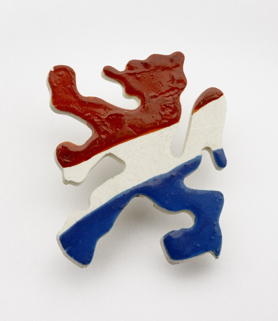 Een houten speldje in de vorm van de klimmende Nederlandse Leeuw in de kleuren rood, wit en blauw die diagonaal zijn aangebracht.