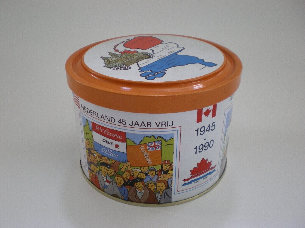 Een snoeptrommeltje met op de deksel met oranje rand de afbeelding op een wit veld van Nederland in de kleuren van de Nederlandse vlag met daarop een tank die het land binnenrijdt. Op de zijkant: "Nederland 45 jaar vrij" en "Welcome again Veterans" met afbeeldingen van: vechtende soldaten, juichende mensen en de Canadese, Britse en Amerikaanse vlag.