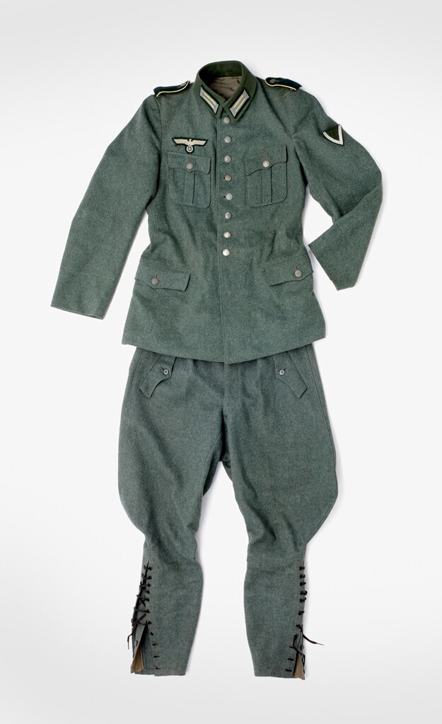 Een Duits legeruniform van groen wollen stof bestaande uit een tuniek en een broek. Model 1940: de groene kraag werd later in de oorlog vervangen door een van "feldgrau". Distinctieven van een infanteriesoldaat eerste klas (Gefreiter).