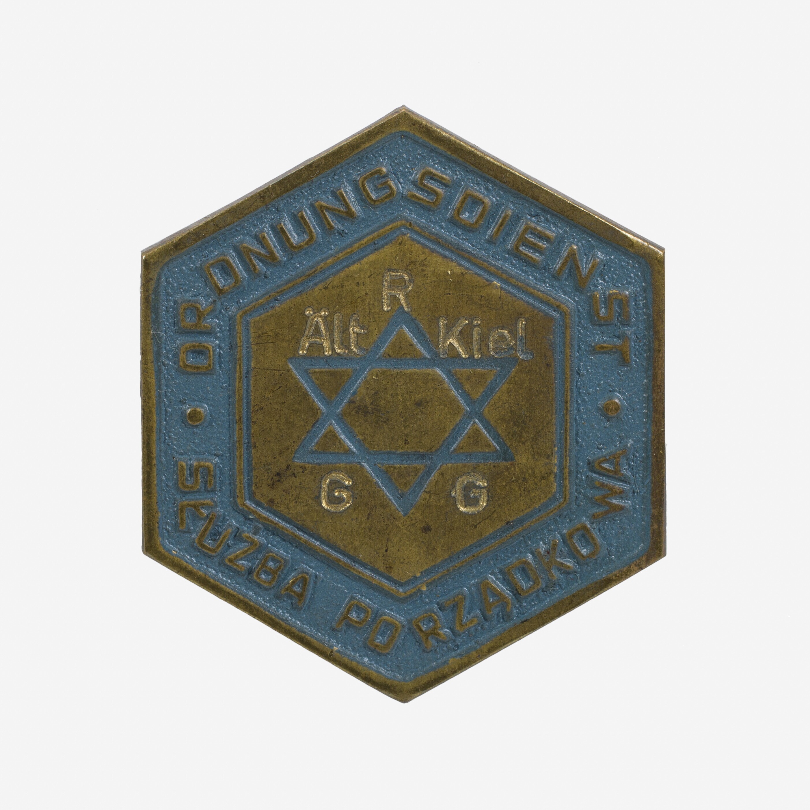 Een zeshoekige koperkleurige penning met aan de achterkant een pin met een schroefdraad, waar een rond koperkleurig plaatje over kan draaien. Op de penning een is een Davidster gegraveerd en met blauwe kleur ingevuld. Rond de ster: "Ält R Kiel G G". Langs de rand op een blauwe achtergrond in reliëf: "Ordnungsdienst. Sluzba Porzadkowa".