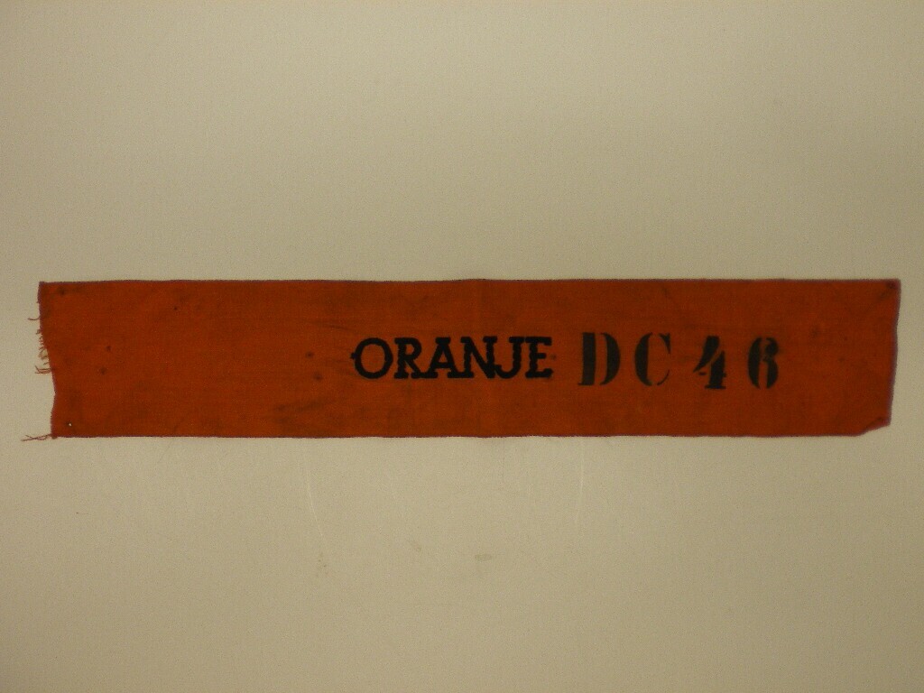 Een mouwarmband van oranje textiel met in het midden met zwart garen "Oranje" geborduurd en daarnaast in zwarte sjabloonletters/cijfers: "DC 46".