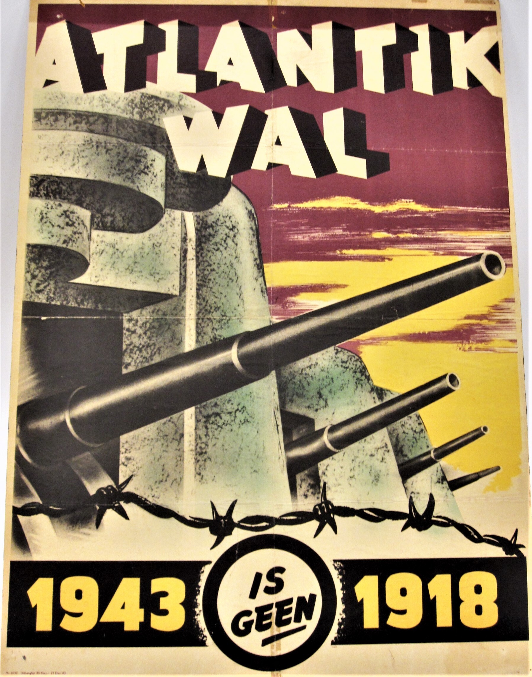 Een affiche met de afbeelding van een rij bunkers waaruit de lopen van kanonnen steken. Voor de bunkers is prikkeldraad te zien. Op het affiche de tekst: "Atlantik wal. 1943 is geen 1918." Onder de afbeelding: "Nr. 5032. Uithangtijd 30 Nov. - 21 Dec. 43."
