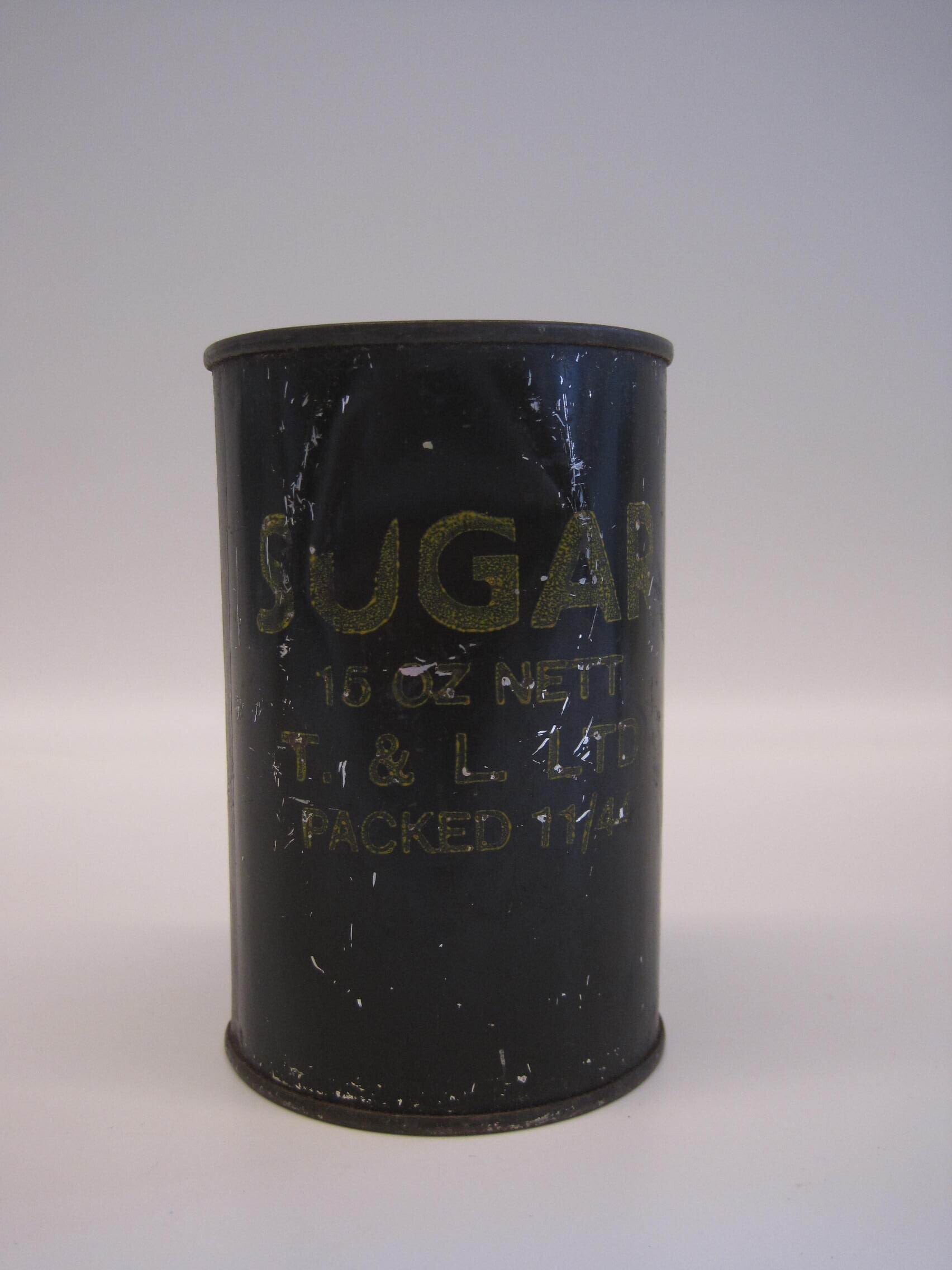 Een groen geverfde conservenblik met in gele sjabloonletters: "Sugar 15 OZ Nett T.&L. Ltd Packed 1/44".