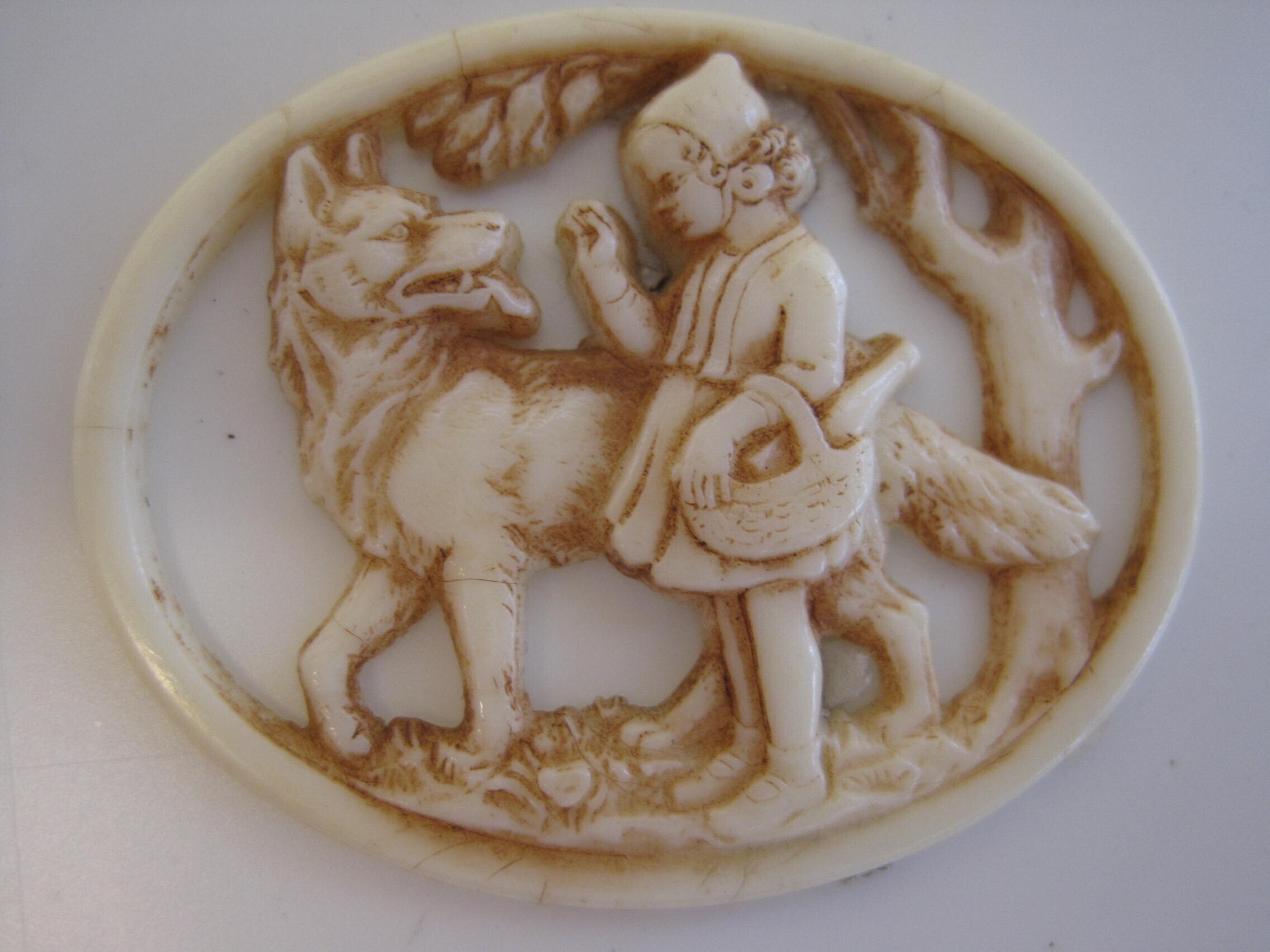 Een ovaal plastic speldje uit de serie speldjes met afbeeldingen uit sprookjes die werden uitgereikt tijdens de collectie op 27 en 28 december 1940 van de Winterhulp Nederland. Dit speldje geeft een scène weer uit het sprookje Roodkapje: afgebeeld zijn Roodkapje en de wolf.