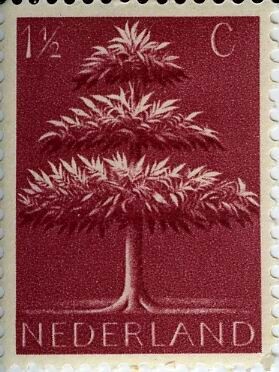 Een paarse postzegel "Nederland 1 1/2 C" met de afbeelding van een in drie lagen gesnoeide boom. Deze driekronenboom is te vergelijken met de meiboom en daarmee met de levensboom. De drie lagen staan vermoedelijk voor de onderwereld, de bovenwereld en de hemel. De postzegel behoort tot een serie van zeven postzegels met 'Germaanse symbolen' ontworpen door Pyke Koch onder toeziend oog van de Duitse bezetter.