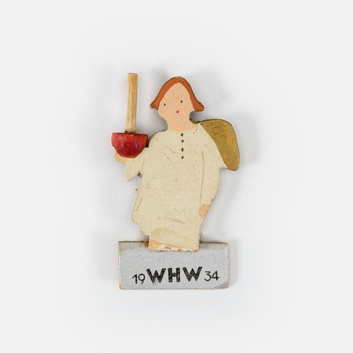 Een houtsnijwerkje met de voorstelling van een engel met een kaars in de linker hand. Het engeltje is voornamelijk in de kleuren wit, goud, bruin en rood geverfd. Onderaan is het engeltje gevat in een rechthoekig zilver geverfd kartonnen houdertje. Op het zilver in zwarte letters: "19 WHW 34". Op de achterkant en stempel met: "Erzgebirge 134".