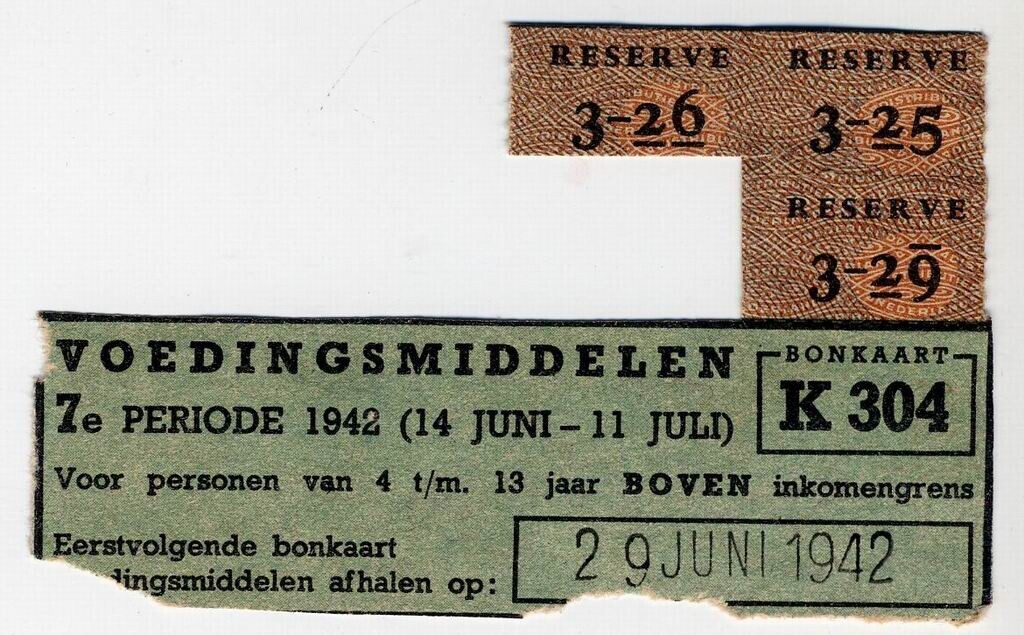 Gedeelte van een gebruikte bonkaart K304 - Voedingsmiddelen 7e periode 1942 - (14 juni - 11 juli) voor personen van 4 t/m 13 jaar boven inkomengrens - met zwarte, oranje en groene opdruk.