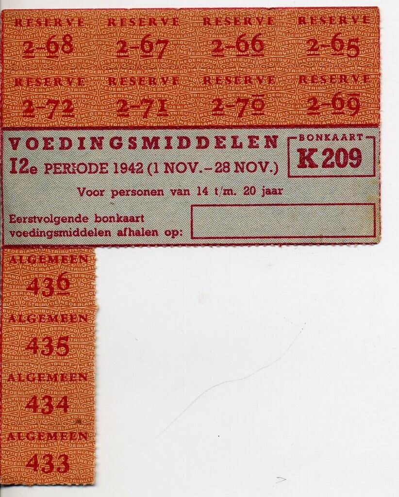 Gedeelte van een gebruikte bonkaart K 209 - Voedingsmiddelen 12e periode 1942 - (1 nov. - 28 nov.) voor personen van 4 t/m 20 jaar. - met rode, blauwe en oranje opdruk.