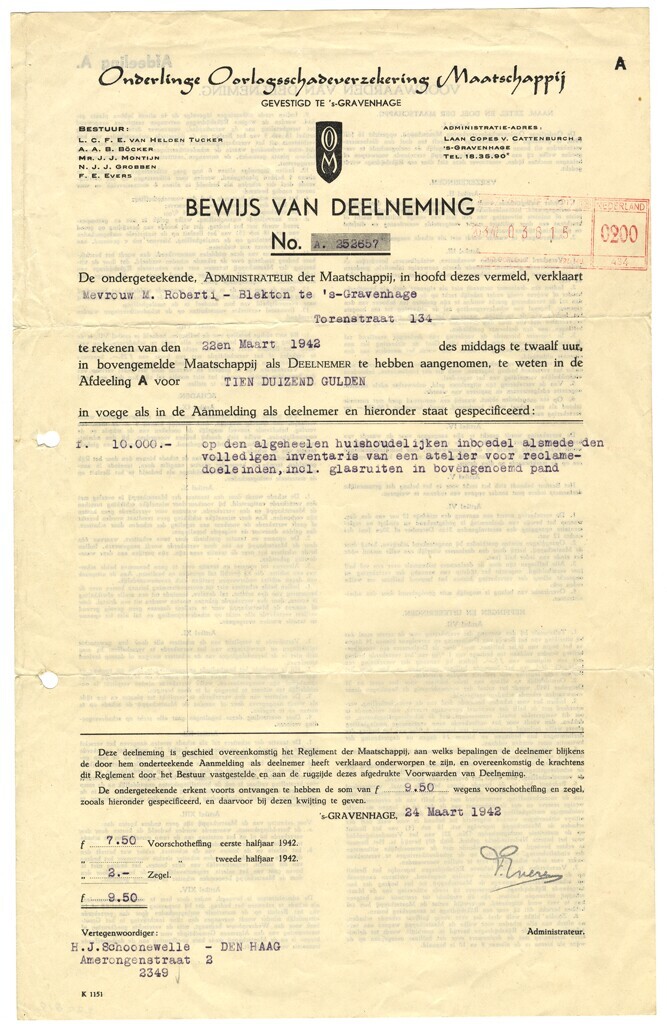 Een verzekeringsformulier van de Onderlinge Oorlogsschadeverzekering Maatschappij (OOM) te 's-Gravenhage gesteld op naam van mevrouw M. Roberti-Blekton te 's-Gravenhage. Het gaat om een "Bewijs van Deelneming no. 252657" aan een inboedelverzekering ter waarde van f.10.000,- , opgemaakt op 22 Maart 1942 en getekend op 24 Maart 1942. Op de achterkant staan de voorwaarden van deelneming gedrukt.