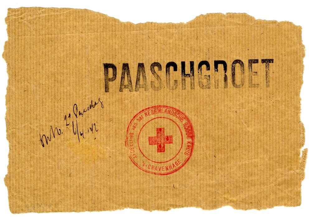 Een afgescheurd stuk pakpapier met twee stempels: "Afdeeling van het Nederlandsche Roode Kruis - ' s-Gravenhage" met rode inkt en "Paaschgroet!" met zwarte inkt. Met pen staat geschreven: "ontv. 2e Paasdag 6/4 '42".