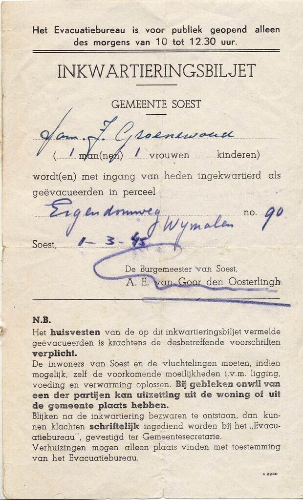 Een 'ringbandalbum' van het merk "Duopress" met een zwarte kartonnen kaft. Op de rug de titel: "Voorspel van de bevrijding 2 Maart 1945 - 30 April 1945". In het album zijn op doorzichtige vellen papier krantenknipsels geplakt die gaan over alles wat met de oorlog in deze periode te maken heeft. Tussen de geplakte krantenknipsels zijn ook andere documenten te vinden in het album: - Brieven na het bombardement op het Bezuidenhoudt te Den Haag: * Een met potlood geschreven brief aan de familie Moerman van mevrouw H.H. Beyerinck-Kielstra met het verzoek aan de familie Schut wat aardappelen mee te geven voor de familie Moerman. Op de achterkant staat met pen het relaas van een uitstapje met de fiets; * Een met potlood geschreven brief aan Lex en Mies Schut van Frits Beyerinck, gedateerd op 6 maart 1945. Onderaan staat met pen geschreven: "Hanny en Frits Beyerinck-Kielstra verloren bij den brand van het Bezuidenhout bijna alle have en goed."; - Krant: * "Het Parool": 5 maart 1945, no. 99; 29 april 1945, no. 155 - Den Haag; 16 april 1945 - Den Haag en omstreken; 30 april 1945, no. 156; * "Trouw": 6 maart 1945 - Amsterdam en omstreken; 7 maart 1945 - Den Haag en omstreken; 8 maart 1945 - Amsterdam en omstreken;12 maart 1945, no. 6 - Utrecht; 12 maart 1945, no. 33 - Utrecht; 13 maart 1945, no. 56 - Amsterdam en omstreken;15 maart 1945, no. 57- Amsterdam en omstreken; 17 maart 1945, no. 58 - Amsterdam en omstreken; 29 maart 1945, no. 63 - Amsterdam en omstreken; 2 april 1945, no. 57 - Rotterdam en omstreken; 6 april 1945, no. 65 - Amsterdam en omstreken;7 april 1945, no. 66 - Amsterdam en omstreken; 10 april 1945, no. 67 - Amsterdam en omstreken;12 april 1945, no. 68 - Amsterdam en omstreken;14 april 1945, no. 69 - Amsterdam en omstreken;17 april 1945, no. 70 - Amsterdam; 21 april 1945, no. 72 - Amsterdam en omstreken; 24 april 1945, no. 73 - Amsterdam en omstreken; 26 april 1945, no. 74; 26 april 1945, no. 42; 28 april 1945 - Amsterdam en omstreken, no. 75; * "Vrij Nederland": 8 maart 1945, no. 79; 20 maart 1945, no. 59 - Amsterdam en omstreken; 24 maart 1945, no. 61- Amsterdam en omstreken; 26 maart 1945, no. 94; * "Strijd": 14 maart 1945, no. 124; * "Ons Volk": maart 1945, no. 23; Paasnummer, no. 24;14 april 1945; * "Koningin Wilhelmina Baronesse van Breda. Breda in 1813 en in 1944"; * "Dagblad voor Noord-Holland": 29 maart 1945, no. 36; 3 april 1945, no.37; 5 april 1945, no. 38;7 april 1945, no. 39; * "De Vrije Pers": 2 april 1945, no. 78 - Rotterdam;16 april 1945, no. 84; 20 april 1945; * "Het laatste nieuws": 6 april 1945; * "Algemeen Handelsblad": 16 april 1945 no. 38720;17 april 1945, no. 38721; 18 april 1945, no. 38722;19 april 945, no. 38723; 21 april 1945 no. 38725; 24 april 1945, no. 38727; 25 april 1945 no. 38728; 27 april 1945, no. 38730; 28 april 1945, no. 38731; 30 april 1945; * "De Residentiebode": 13 april 1945 no. 12742; 27 april 1945, no. 12753; 26 april 1945, no. 12752; 28 april 1945, no.12754;30 april 1945, no. 12755; * "Ons Ochtendblad": 18 april 1945 - Den Haag en omstreken; 28 april 1945 - Den Haag en omstreken; * "Veritas": 20 april 1945, no. 221;21 april 1945, no. 222; 23 april 1945, no. 223; 24 april 1945, no. 224; 25 april 1945, no. 225; 27 april 1945, no. 227; 29 april 1945, no. 229; 30 april 1945, no. 230; * "De Stem": Noord-Brabant, 20 april 1945, no. 144; * "Nederlandsch Nieuws": 25 april 1945, no. 33; * "Het Vrije Geluid": 26 april 1945 no. 93; * "Nieuwsbulletin": 30 april 1945. - Pamflet/rondschrijven: * Een oproep aan vrijwilligers zich te melden voor "bergings-, opruimings- en hertsellingsdiensten" voor: "Loon: Bruto f6,-- per werkdag met bijvoeding op het werk. Werktijd: van 8 uur tot 16 uur met etenspauze. Leeftijd: 41 jaar en ouder". Dit naar aanleiding van het bombardement van de Bezuidenhoudt in Den Haag; * Een drukwerkje bestaande uit 3 bladzijden met op het voorblad: "10 October 1944 - Hoe de beestmensen huishielden in ons dorpje Putten en Tijdgedicht Hulde aan het Zwitserse en Zweedse Rode Kruis"; * Een strook papier met de tekst: "Met dank voor Uw medewerking, Het Nederlandse Roode Kruis, no. 20175"; * Een pamflet waarin uit naam van de burgemeester van Den Haag wordt gesteld dat het verboden is om bouwmaterialen of restanten daarvan uit de puinhopen "van de perceelen, welke op 3 maart 1945 door oorlogsgeweld in de gemeente 's-Gravenhage geheel of nagenoeg geheel zijn verwoest (Bezuidenhoutkwartier, Korte Voorhout en omgeving); - Prentbriefkaart: * 3 prentbriefkaarten met zwarte opdruk: één met de afbeelding van Göring voor een microfoon terwijl hij neerkijkt op een verwoestend bombardement. Tekst: "Göring. Had ik maar niets gezegd. Duitsland"; één met de afbeelding van een brandend huis met daarvoor een vrouw aan een galg en een hond met een helm en op zijn lijf de tekst; "Herrenvolk" die een liggende vrouw aanvalt; één met een portret van Hitler met onder hem vier opgeheven vuisten. Linksboven een galg en rechtsboven de dood. Onderaan: "Voorzienigheid". * 1prenbriefkaart met kleurendruk. Afgebeeld is een voedseldropping, waarbij ook een koe en een varken uit de lucht komen vallen. Tekst: "De goede gaven daalden neer, Zóó'n bommenregen smaakt naar meer. Clinge Doorenbos". Rechtsboven gesigneerd: "Th. Lensen". * 1 prentbriefkaart in kleurendruk van een bommenwerper waaruit pakketten vallen. Tekst: "British and American food for starving Holland. Voedselbombardement Schiphol. 2 mei 1945. Thank you America!". - Verklaring: * Een "Inkwartieringsbiljet. Gemeente Soest" op naam van de fam. J. Groenewoud waarbij de verordenering staat: "Het huisvesten van de op dit inkwartieringsbiljet vermelde geëvacueerden is krachtens de desbetreffende voorschriften verplicht". Gedateerd: Soest, 1 maart 1945. * "Bewijs van Ontvangst" van een pakje. Op het bewijs staat met potlood geschreven: "Huis door BOM getroffen en staat dus leeg. Buuren weten niet waar zij zijn"; * Een bon van het "Roode kruis" met een stempel van "C.W.V. 'Eigen Hulp' u.a. Filiaal: Laan va