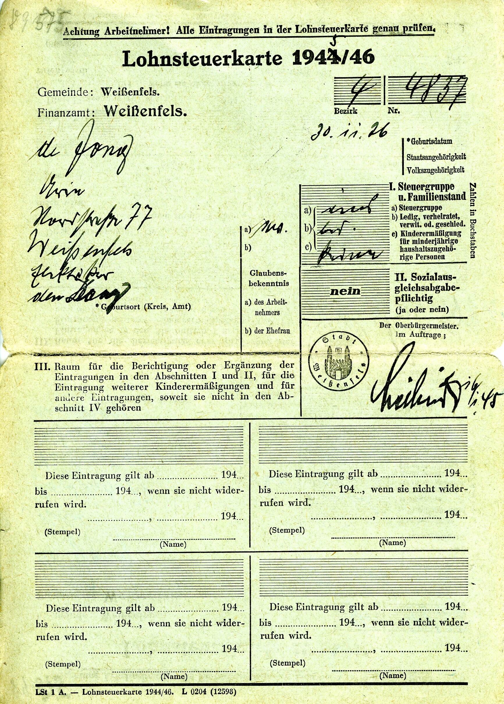 Een "Lohnsteuerkarte 1945/46" opgesteld op 16 januari 1945 door de gemeente Weissenfels op naam van "de Jong" geboren te Den Haag en woonachtig op een adres in Weissenfels.