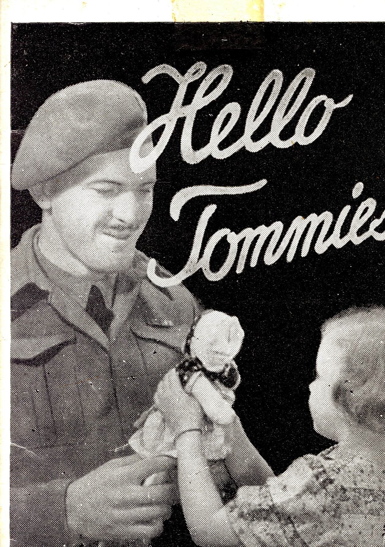 Een taalboekje Nederlands-Engels in een slappe kaft. Op de voorkant staat: "Hello Tommies!" en de afbeelding van een militair en een meisje die beiden een pop vasthouden. Linksonder de afbeelding van een esdoornblad als nationaal symbool van Canada. Op de titelpagina staat: "Hello Tommies! door/by Johan Fruytier. Voor ieder een huis-Canadees. Every Canadian his Dutch home. 'n S.J.P. Bakker-uitgave - a .J.P. Bakker publication".