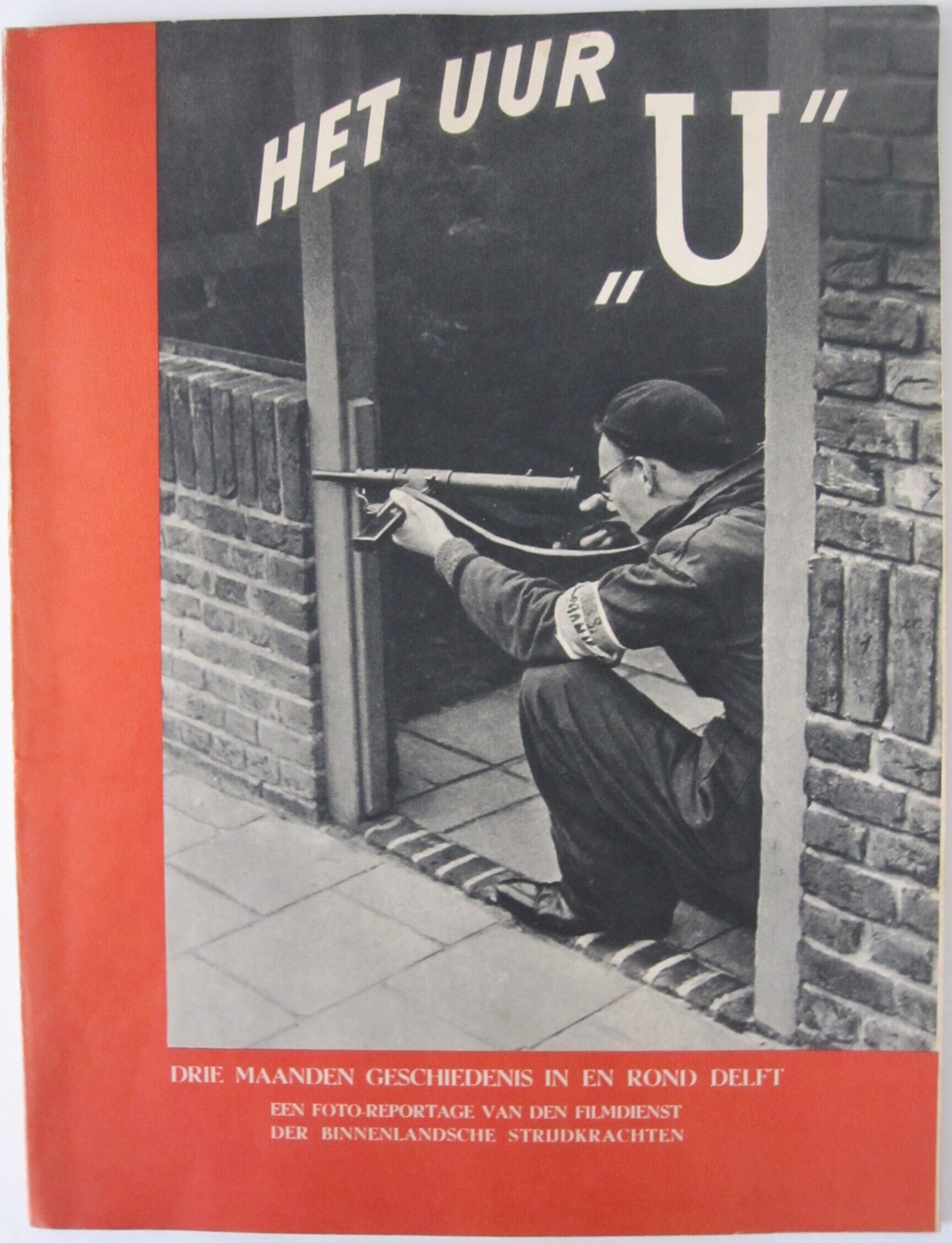 Een uitgave in een slappe kaft met op een rode achtergrond een afgedrukte zwart-wit foto van een gehurkte man in een deuropening met het geweer in de aanslag. De man heeft om de linker arm een mouwband van de Nederlandse Binnenlandse Strijdkrachten. Bovenaan staat: "het uur 'u'" en onderaan: "Drie maanden geschiedenis in en rond Delft. Een foto-reportage van den Filmdienst der Binnenlandsche Strijdkrachten". De reportage is uitgegeven ten bate van de Stichting "1940-1945" door de Delftsche Uitgevers Maatschappij" met een inleiding door Dr. Ir. .M. Heertjes, Oud-gewestelijk Commandant der Binnenlandsche Strijdkrachten".