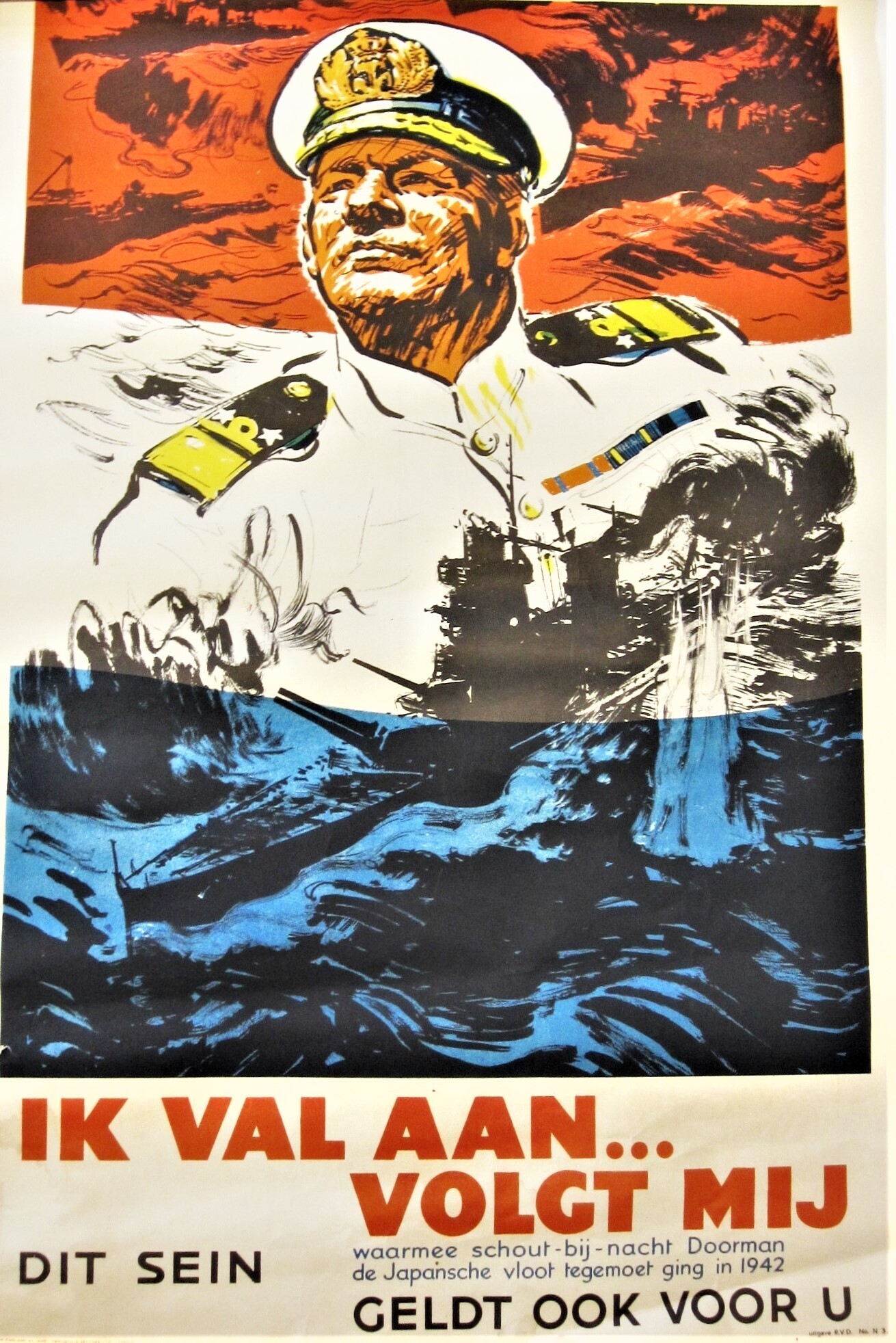 Een affiche met de afbeelding van Schout-bij-nacht Karel Doorman op de achtergrond van de Nederlandse driekleur en oorlogsschepen onder vuur. Onder de afbeelding staat "k van aan...volg mij. Waarmee schout-bij-nacht Doorman de Japansche vloot tegemoet ging in 1942. Dit sein geldt ook voor U".